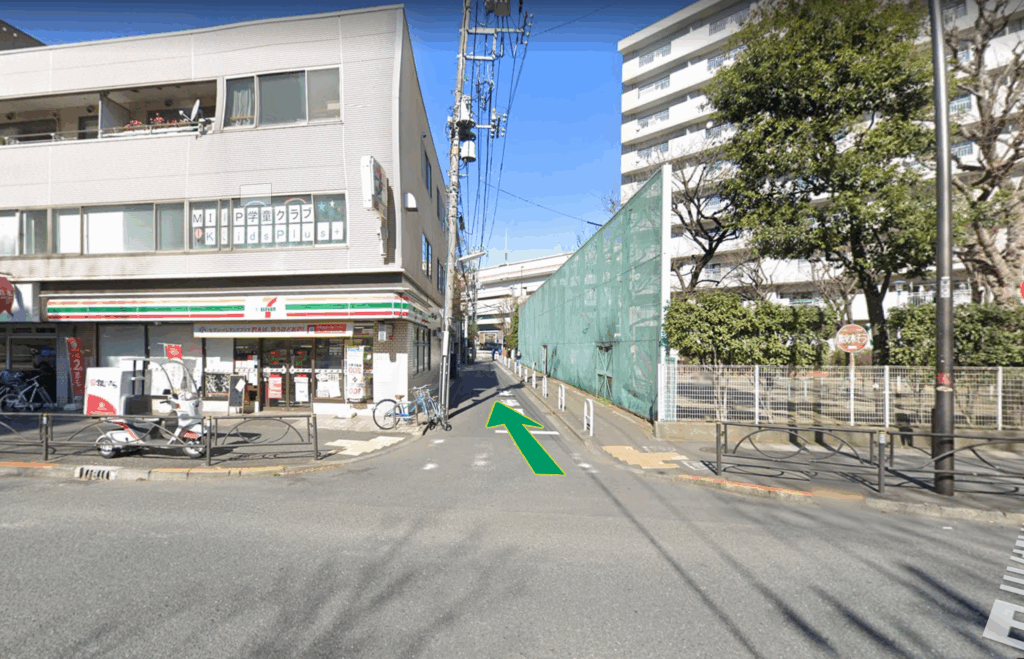 ⑤ After turning, continue until you reach the first crosswalk. After crossing the street, you will find a 7-Eleven on your left.