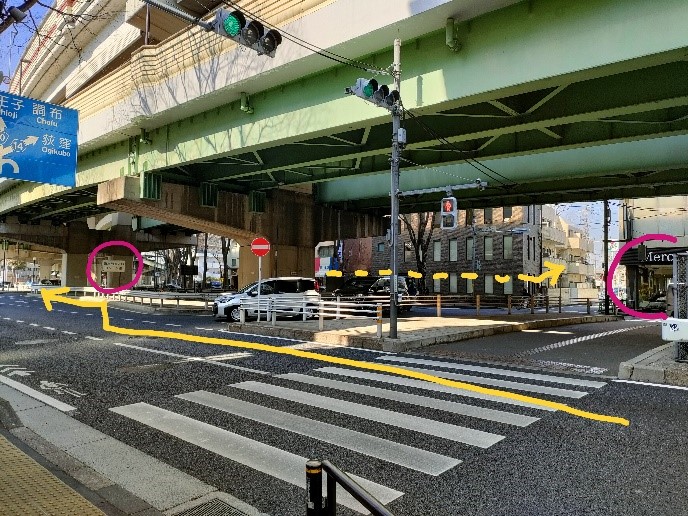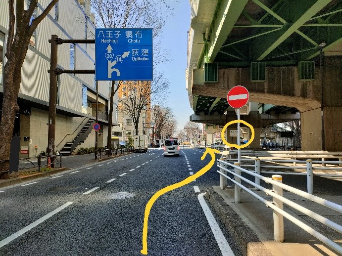 ① 国道20号線を八王子方面に進みます。上北沢駅付近に写真の看板が見えたら、一番右のUターン車線に入ってください。国道14号線にははいらず、反対車線にUターンしてください。