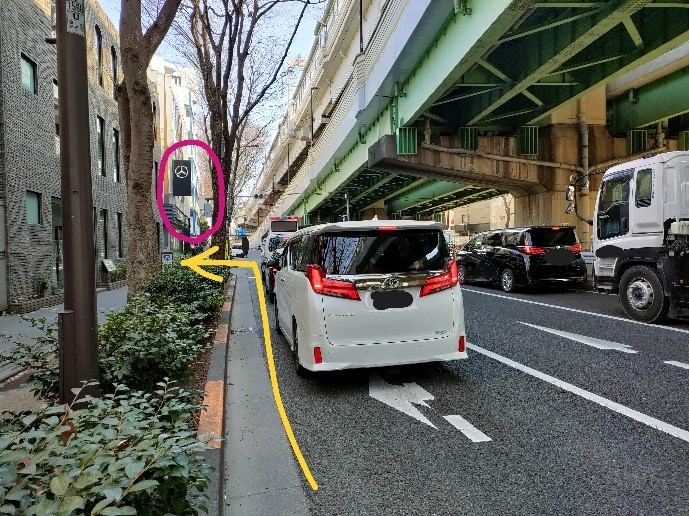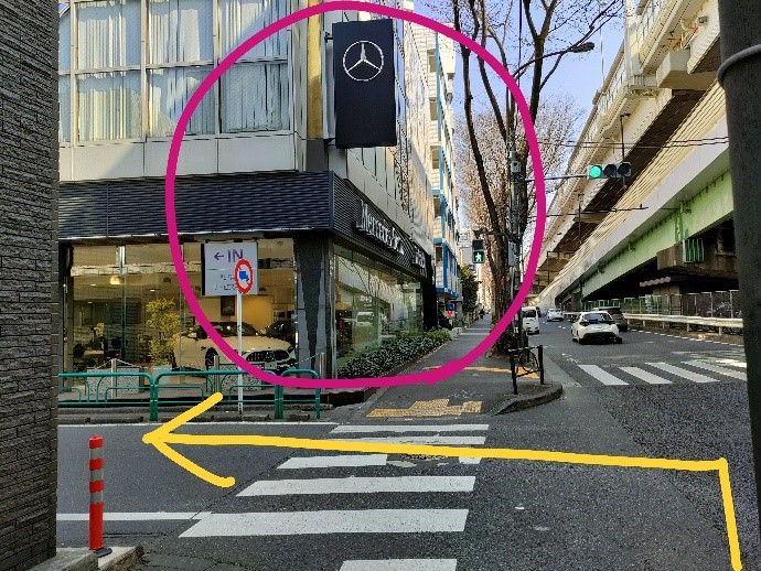③ Uターンした後の写真です。メルセデス・ベンツのお店手前で左折し、鎌倉街道に入ります。