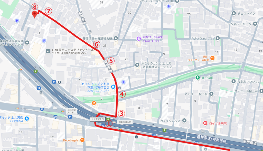 写真付きの道順ガイド:以下は、新宿方面から当院へお越しいただく際のルートを、写真でわかりやすくご案内したものです。