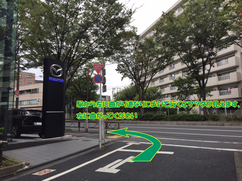 ④マツダのディーラーが見えてきますので、そこで左に曲がってください。